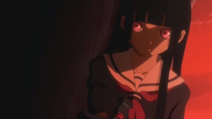 Sobre os personagens adoro todo, mas claros tem uns que gosto mais que outros, Enma Ai. é um dos personagens que eu amo deste anime, ela possui um visual de melancolia e sofrimento, expressão indiferente e fria, cabelos escuros e olhos vermelhos repletos de uma tristeza profunda e amarga, uma personagem para ser lembrada, pois além do carisma que possui, a sua personalidade se encaixa perfeitamente em sua bela história que, por sinal, é a melhor parte do anime.